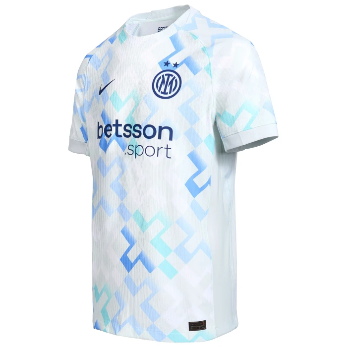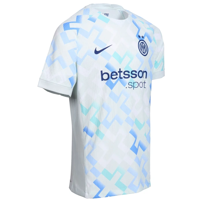 The new Inter Away Jersey 2025/26, designed by Nike, pays tribute to the Club’s founding principles: inclusion and diversity.The woven pattern, inspired by artisanal textiles, visually represents community and collective strength — values that have always defined Inter’s identity.Part of the Match collection, this jersey is the same authentic model worn by the professionals on the pitch, featuring premium details and next-generation performance technology.Made from 100% recycled polyester, it incorporates Nike Dri-FIT ADV, developed through athlete testing to deliver complete freshness and comfort. Strategically placed open-hole zones increase ventilation and help keep the skin dry, even in the most intense moments of the game.The jersey can be customized with the name and number of your favorite player and enriched with the official Serie A 2025/26 or UEFA Champions League patches.Product details:Match collection – authentic designWoven pattern inspired by artisanal textilesNike Dri-FIT ADV technology for advanced breathabilityTechnical fabric with open-hole zones for targeted ventilationSilicone crest100% recycled polyesterMachine washableColor: Ghost Aqua / White / Blue Void