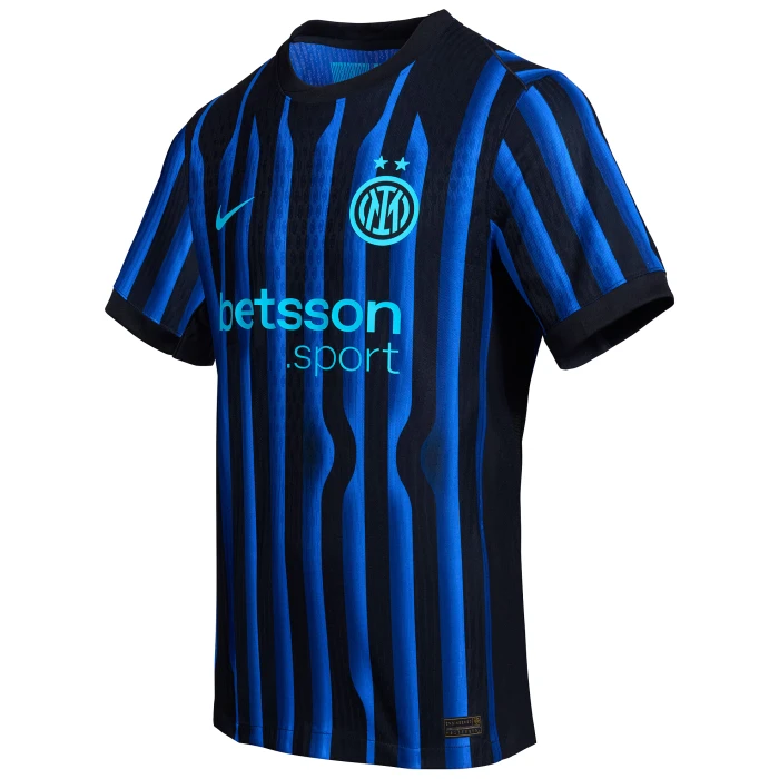 Rooted in tradition yet looking to the future: the new Inter Home Kit 2025/26, designed by Nike, celebrates the team and the city of Milan as global hubs of innovation and creativity.The black base is enhanced by the artistic “Inter” script, inspired by the luminous, futuristic installations of Milan Design Week, a symbol of the city’s dynamic spirit.Part of the Match collection, this jersey is the same authentic model worn by the professionals on the pitch, featuring premium design details and next-generation performance technology.Crafted from 100% recycled polyester, it incorporates Nike Dri-FIT ADV, developed through athlete testing to deliver advanced breathability and lasting freshness. Strategically placed open-hole zones increase airflow and help keep the skin dry even in the most intense moments of the game.The jersey can be customized with the name and number of your favorite player and enriched with the official Serie A 2025/26 or UEFA Champions League patches.Product details:Match collection – authentic designNike Dri-FIT ADV technology for advanced breathabilityTechnical fabric with open-hole zones for targeted ventilationSilicone crest100% recycled polyesterMachine washableColor: Lyon Blue / Black / Chlorine Blue