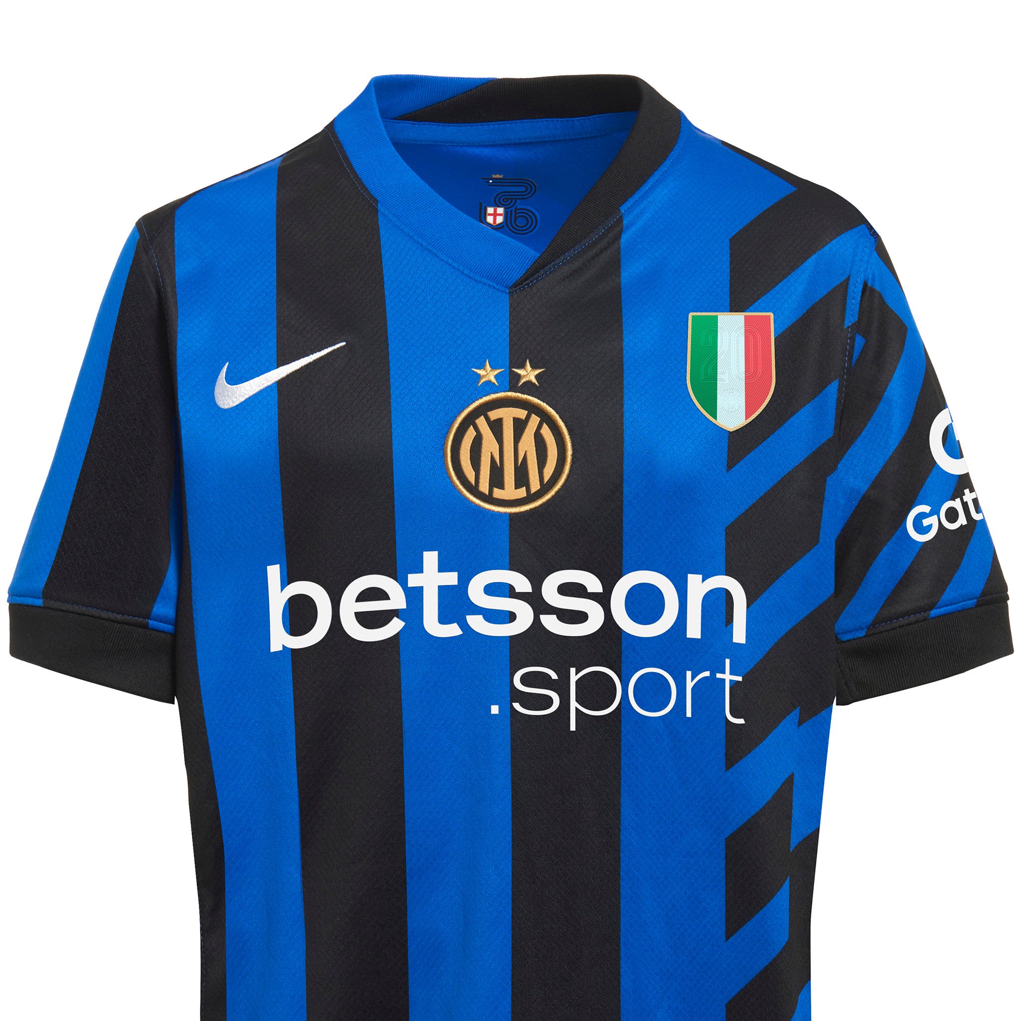 For the first time on our jersey, the second star shines above the logo of the new 2024/25 Home Kit. The Stadium collection replicates the details of the original design with breathable technology for a match look that is inspired by the appearance of the professionals on the pitch. Nike Dri-FIT technology wicks away sweat to encourage rapid evaporation and keep your skin dry for excellent comfort. The jersey is made using recycled polyester. The new Home Kit is completed with matching shorts and socks. You can customise the jersey with the name and number of your favourite player and add the Lega Serie A 2024/25 or Champions League patches on the sleeve