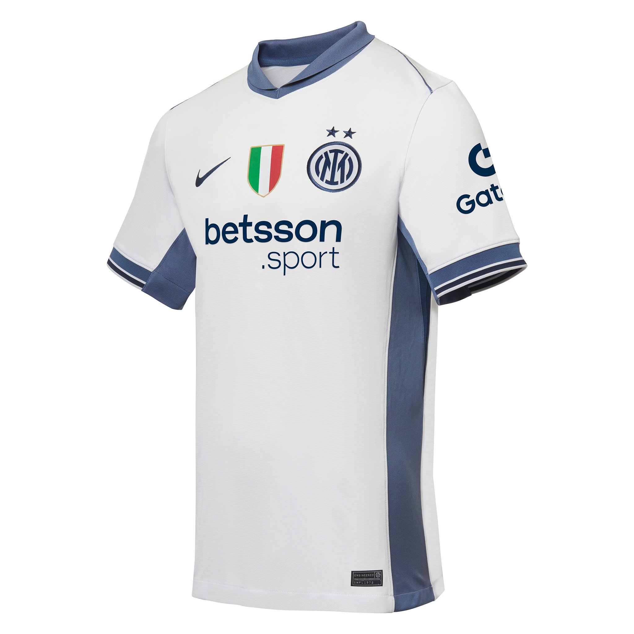 For the first time on our jersey, the second star shines above the logo of the new 2024/25 Away Kit. The Stadium collection replicates the details of the original design with breathable technology for a match look that is inspired by the appearance of the professionals on the pitch. Nike Dri-FIT technology wicks away sweat to encourage rapid evaporation and keep your skin dry for excellent comfort. The jersey is made using recycled polyester. The new Away Kit is completed with matching shorts and socks. You can customise the jersey with the name and number of your favourite player and add the Lega Serie A 2024/25 or Champions League patches on the sleeve.