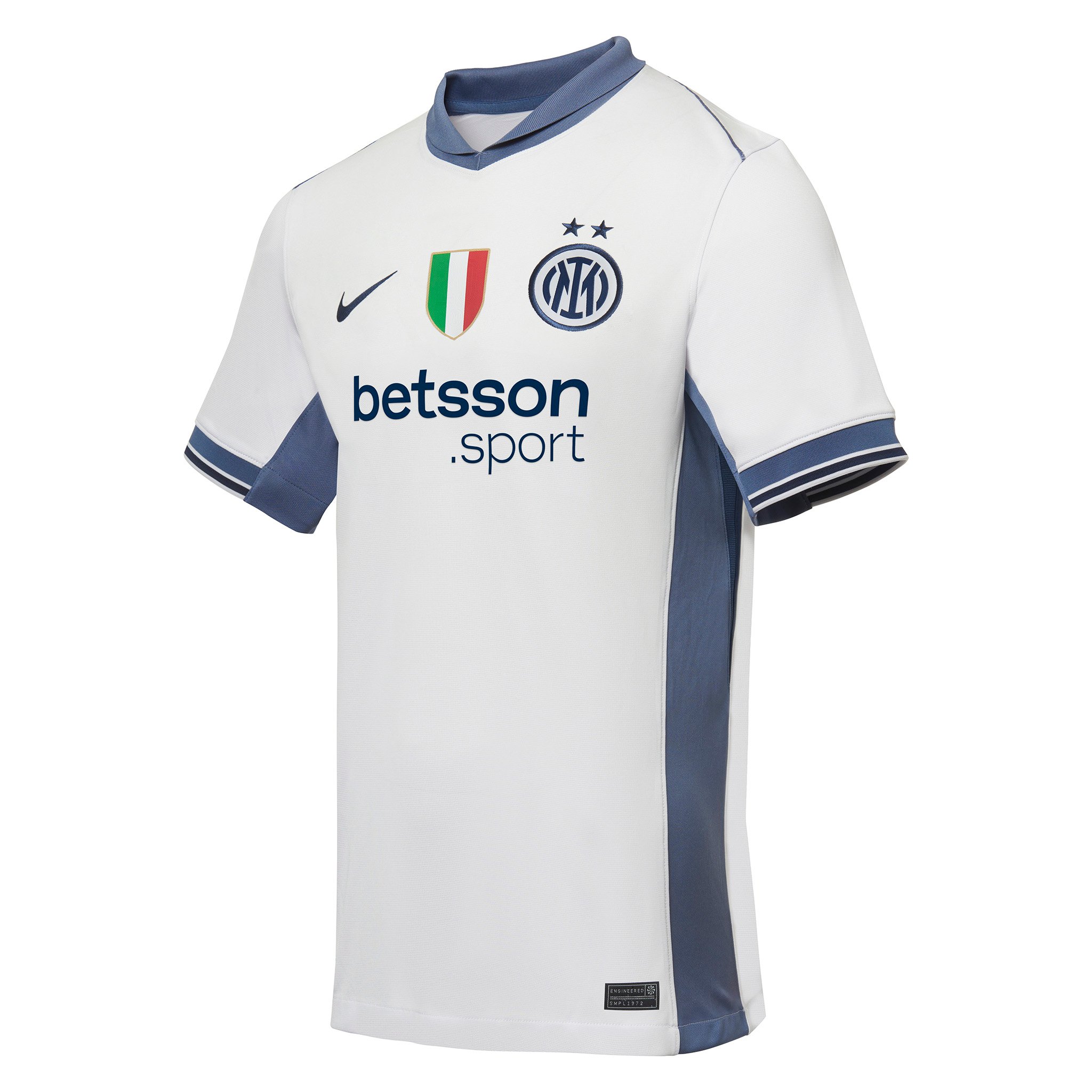 For the first time on our jersey, the second star shines above the logo of the new 2024/25 Away Kit. The Stadium collection replicates the details of the original design with breathable technology for a match look that is inspired by the appearance of the professionals on the pitch. Nike Dri-FIT technology wicks away sweat to encourage rapid evaporation and keep your skin dry for excellent comfort. The jersey is made using recycled polyester. The new Away Kit is completed with matching shorts and socks. You can customise the jersey with the name and number of your favourite player and add the Lega Serie A 2024/25 or Champions League patches on the sleeve.