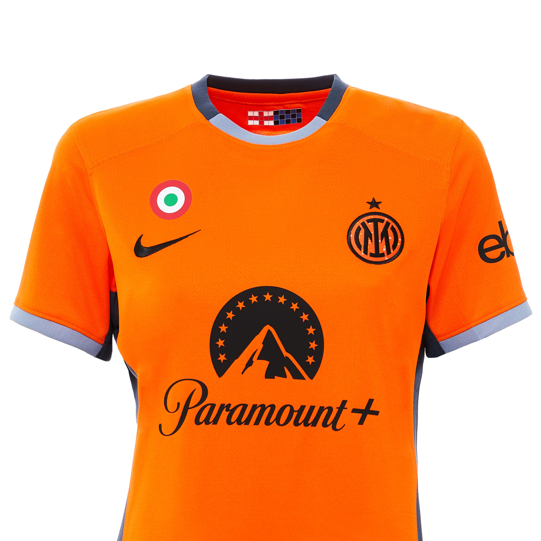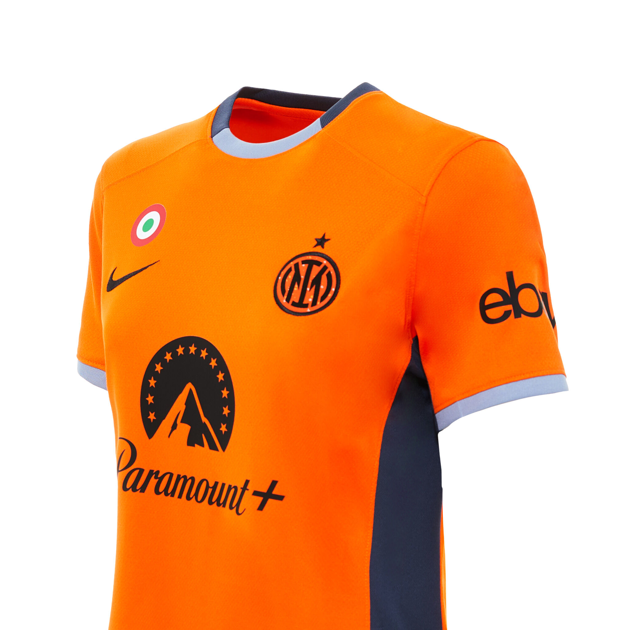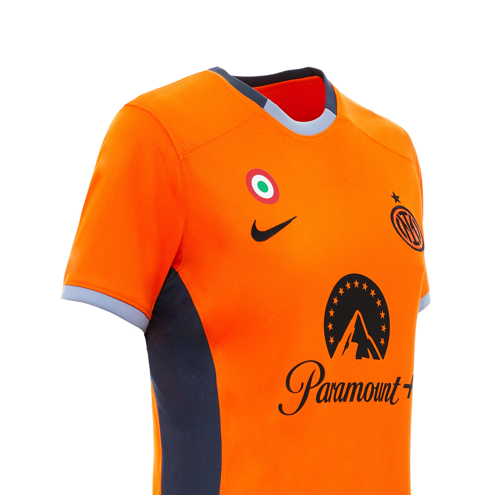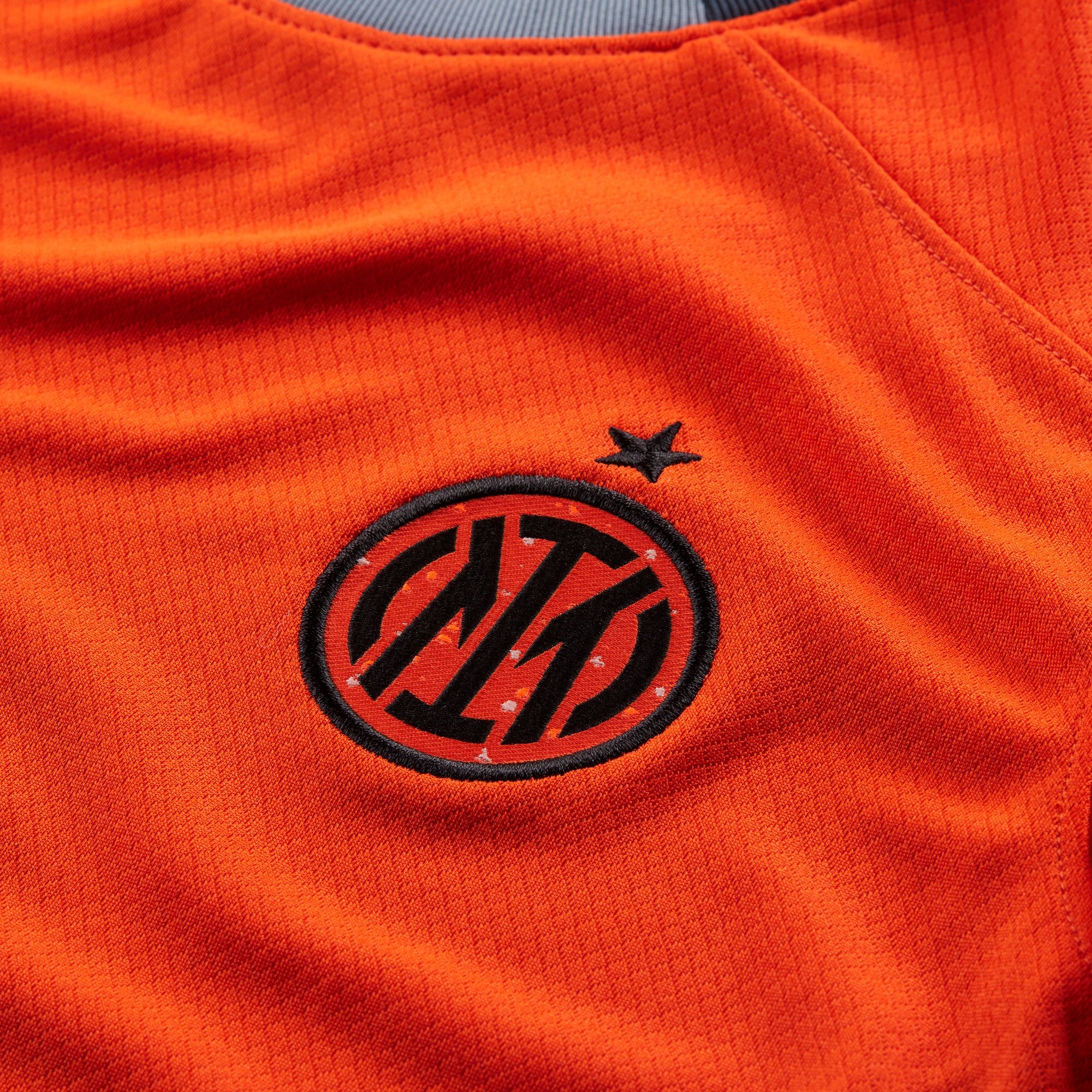 The new INTER 2023/24 Third Jersey in orange with grey collar is inspired by the one from the 2000/2001 season, worn by champions such as Ronaldo, Zanetti and Vieri. Made with a 100% recycled polyester fabric obtained from the recovery of plastic bottles and a new pattern designed to help reduce material waste and environmental impact, the new INTER 2023/24 Third shirt was created with sustainability in mind. The Stadium collection replicates the details of the original design with breathable technology, for a match look inspired by that worn by professionals on the pitch. Nike Dri-FIT technology wicks sweat away to promote rapid evaporation and keep the skin dry for ideal comfort. The new Third Kit comes complete with orange shorts and socks. You can personalise the jersey with the name and number of your favourite player and add the Lega Serie A 2023/24 or Champions League patches on the sleeve.