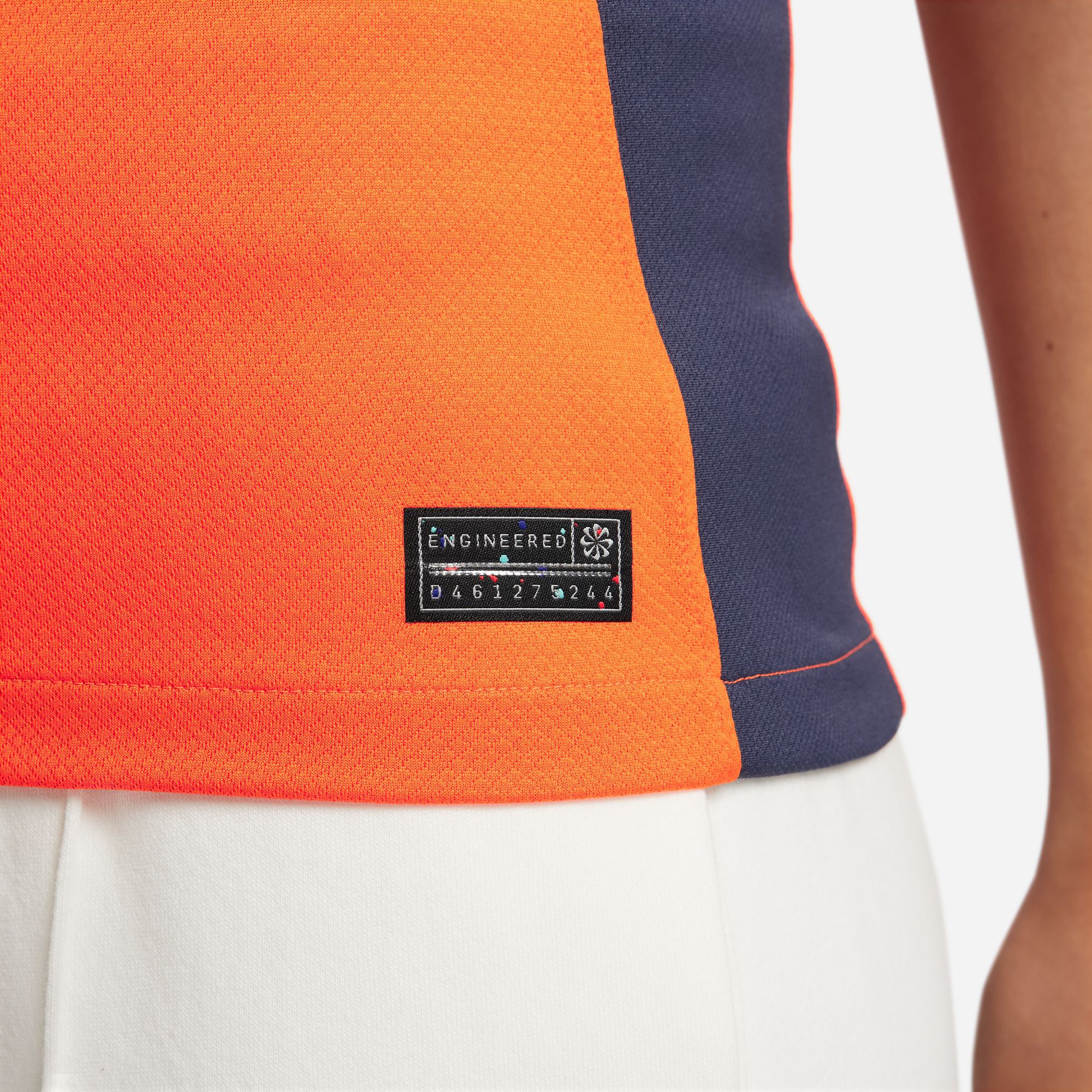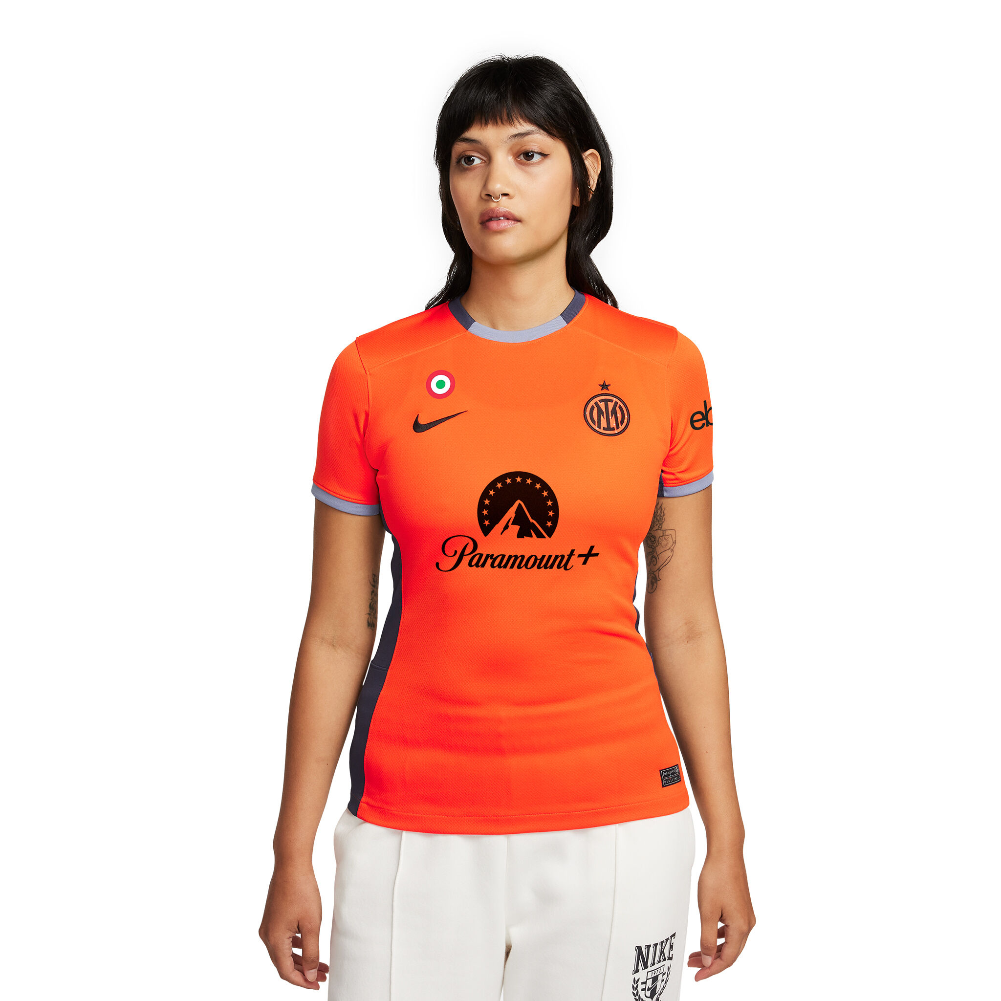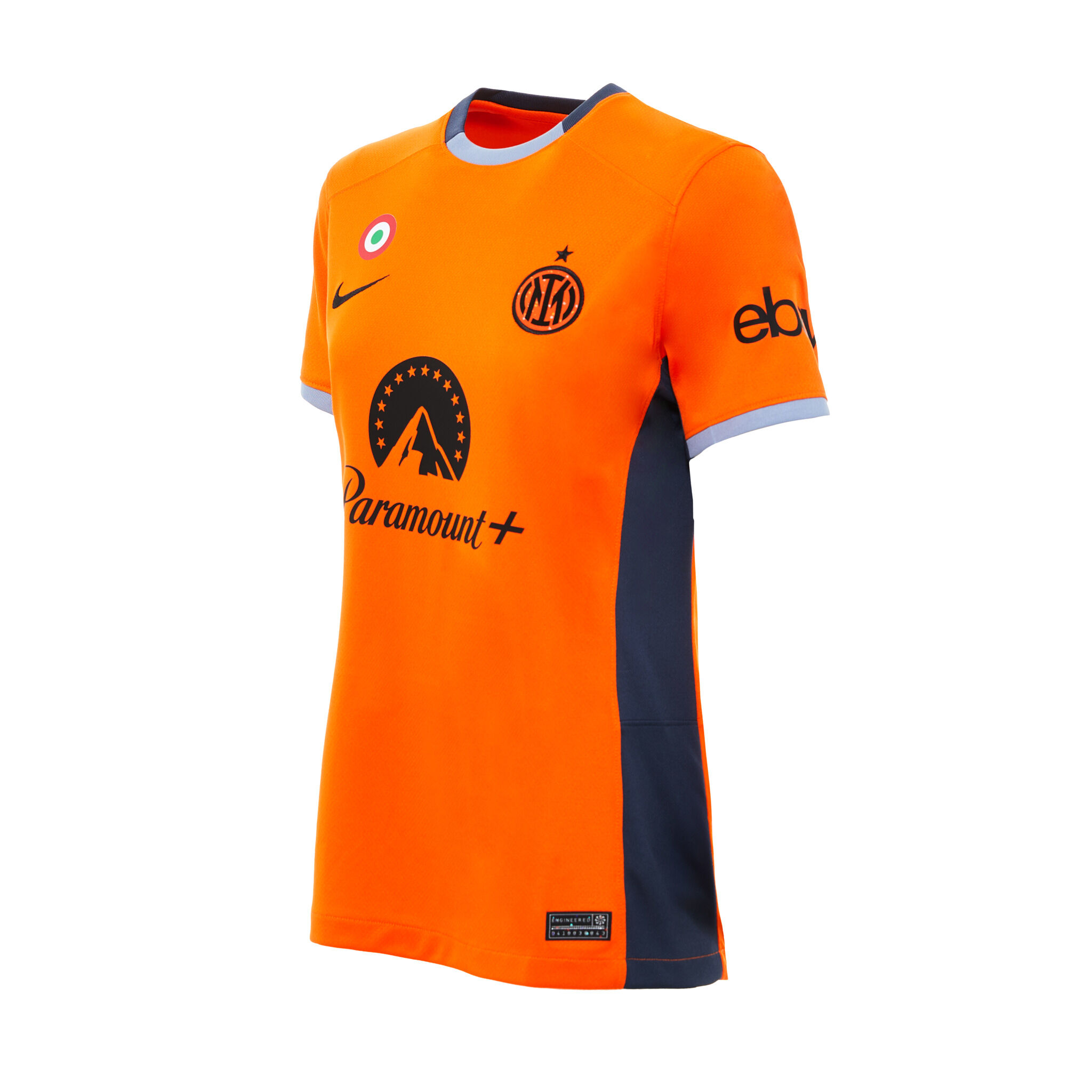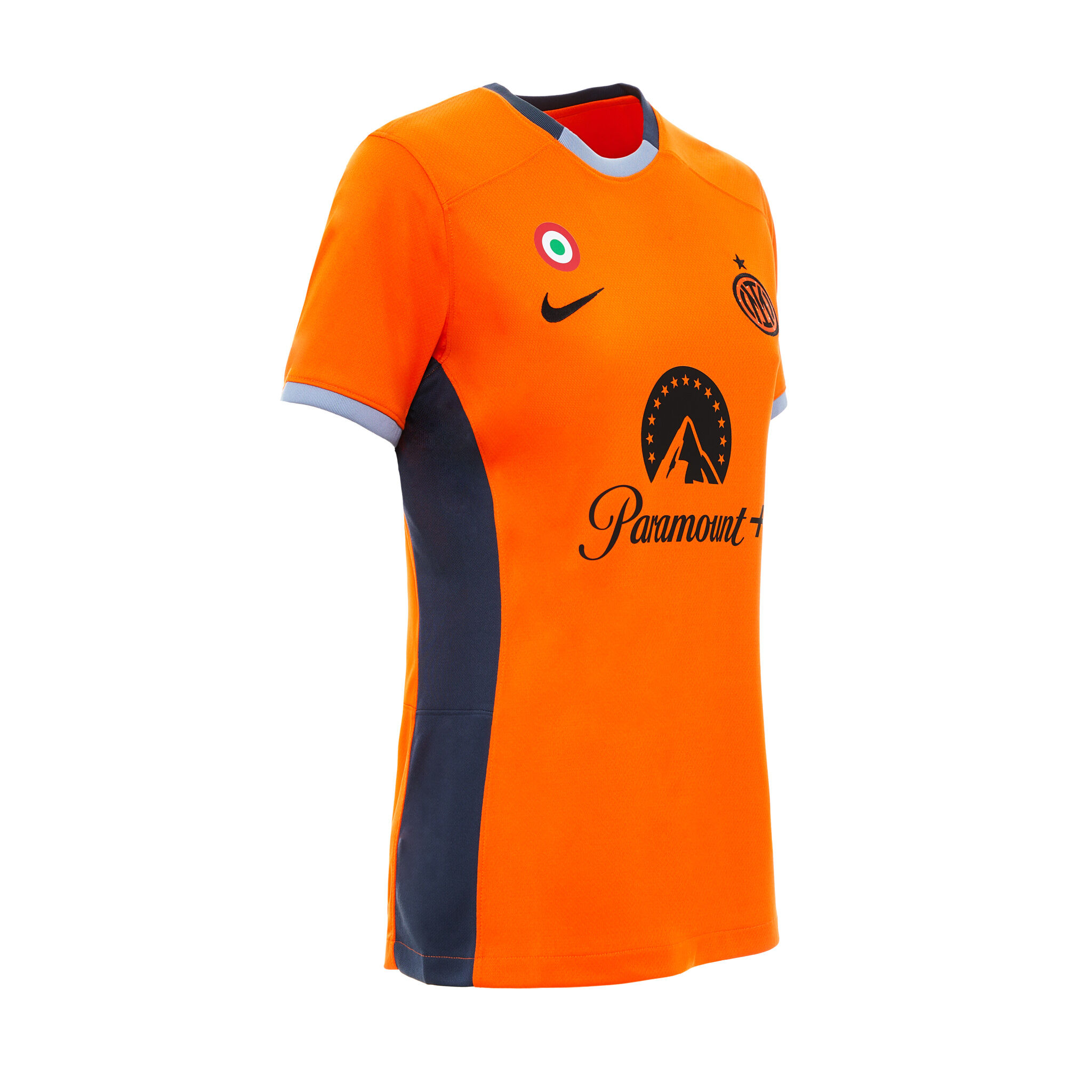 The new INTER 2023/24 Third Jersey in orange with grey collar is inspired by the one from the 2000/2001 season, worn by champions such as Ronaldo, Zanetti and Vieri. Made with a 100% recycled polyester fabric obtained from the recovery of plastic bottles and a new pattern designed to help reduce material waste and environmental impact, the new INTER 2023/24 Third shirt was created with sustainability in mind. The Stadium collection replicates the details of the original design with breathable technology, for a match look inspired by that worn by professionals on the pitch. Nike Dri-FIT technology wicks sweat away to promote rapid evaporation and keep the skin dry for ideal comfort. The new Third Kit comes complete with orange shorts and socks. You can personalise the jersey with the name and number of your favourite player and add the Lega Serie A 2023/24 or Champions League patches on the sleeve.