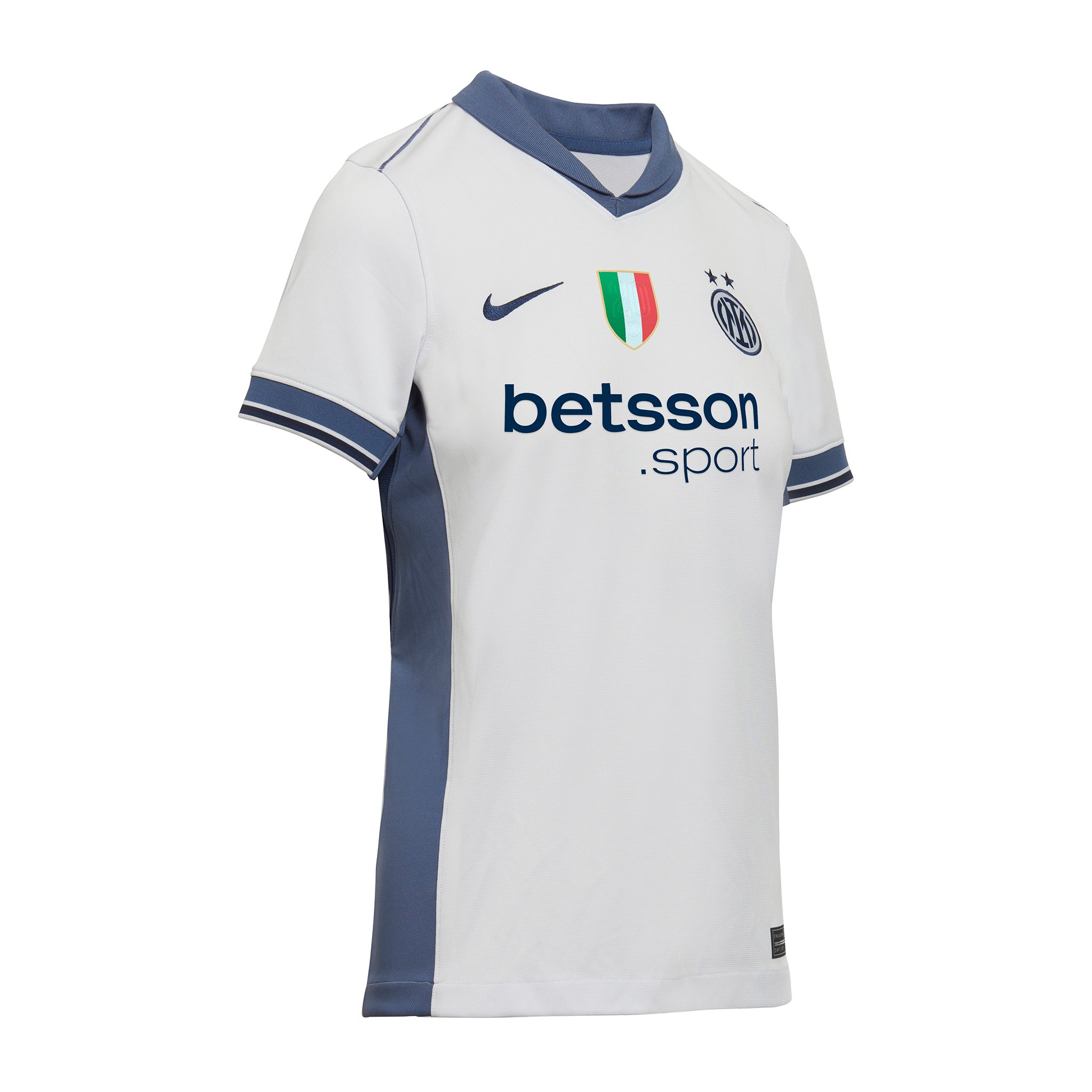 For the first time on our jersey, the second star shines above the logo of the new 2024/25 Away Kit. The Stadium collection replicates the details of the original design with breathable technology for a match look that is inspired by the appearance of the professionals on the pitch. Nike Dri-FIT technology wicks away sweat to encourage rapid evaporation and keep your skin dry for excellent comfort. The jersey is made using recycled polyester. The new Away Kit is completed with matching shorts and socks. You can customise the jersey with the name and number of your favourite player and add the Lega Serie A 2024/25 or Champions League patches on the sleeve.