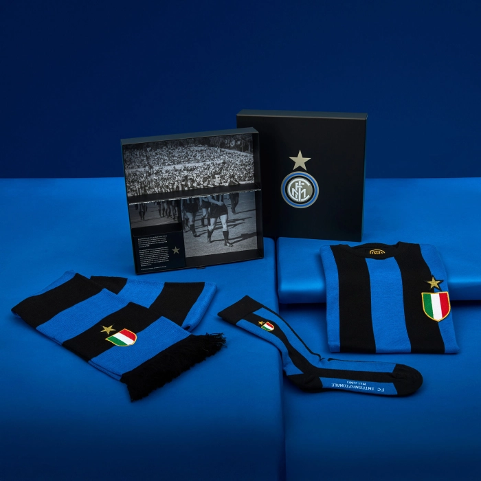 A journey through time, a tribute to our history. This limited edition of 1908 numbered pieces celebrates the second star of Inter, a milestone that would not have been possible without the legendary first star won in 1966. The box features a special graphic dedicated to the initiative, created by the union of the star which symbolises the first ten Scudetti won by Inter, with the official logo from that era from 1963 until 1979, which returns to the classic design created by Giorgio Muggiani. The logo accompanied the era of Grande Inter, with minor adjustments in the intertwining of the letters FCIM and prominent use of the colour gold. Inside of each box, there is a numbered piece of the jersey of the first star, the scarf and socks. The choice of size refers solely to the jersey, while the scarf and socks are one-size.