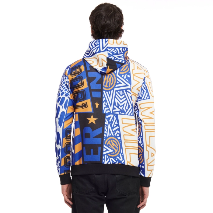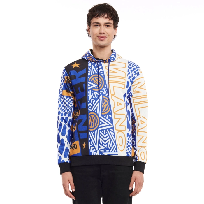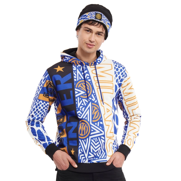 The INTER multi-logo hoodie is an essential piece to wear during winter. It is made from a soft, warm fabric, featuring elasticated cuffs and hem. The design showcases a pattern in black, blue, and yellow that reflects the club’s identity. Regular fit.