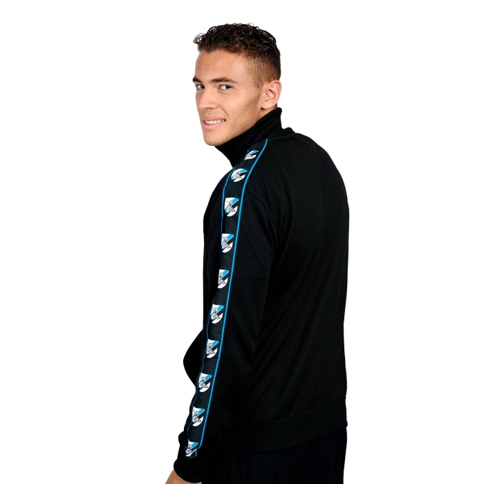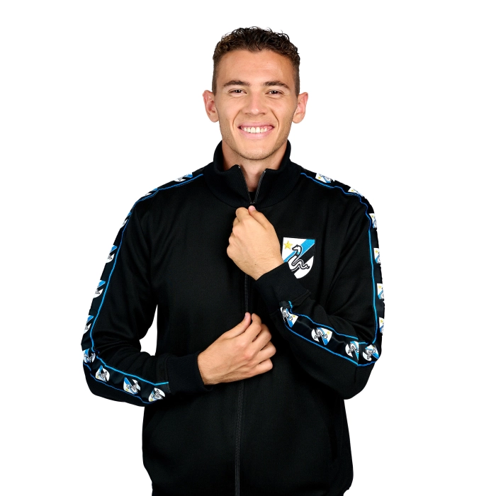 The Retro Taper Jacket is made from soft fabric. It features a high-resolution woven ribbon on the upper shoulders and sleeves, displaying the retro Biscione emblem. The jacket is finished with the retro club logo and Biscione embroidered on the chest.